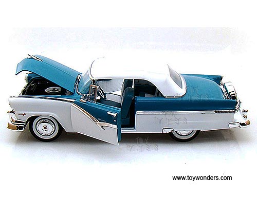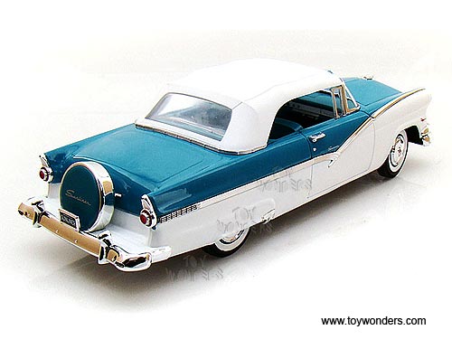 AMM973 Auto World ERTL American Muscle - 1956 Fort Fairlane Sunliner Soft Top. 1:18 scale diecast collectible model car. This Fort Fairlane Sunliner is a 10.5"L x 4.25"W x 3"H die-cast metal car with openable hood & doors, steerable front wheels, and detailed engine, accurate interior and chassis. This 56 Fort Fairlane Sunliner is manufactured by Auto World. Individually packed in a window box. Box size: 13.25"Lx 6.25"Wx 5"H. AMM973 is in BLUE & WHITE 2-tone colors.