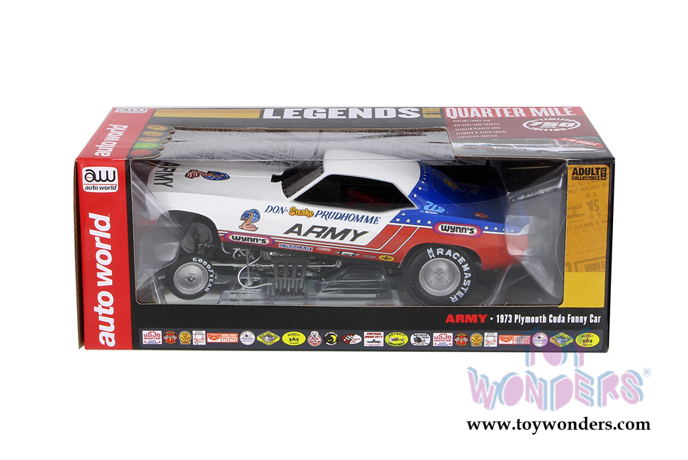 AW1170 Auto World Legends of The Quarter Mile - ARMY - 1973 Plymouth Cuda NHRA Funny Car. 1:18 scale diecast collectible model car. This Plymouth Cuda is a 10.25"L x 3.5"W x 2.75"H car with plastic body, diecast tube chassis, plumbed & wired engine. This 1973 Cuda is manufactured by AutoWorld. Individually packed in a window box. Box size: 13"L x 6.1"W x 5"H. AW1170 is in BLUE/RED/WHITE color.