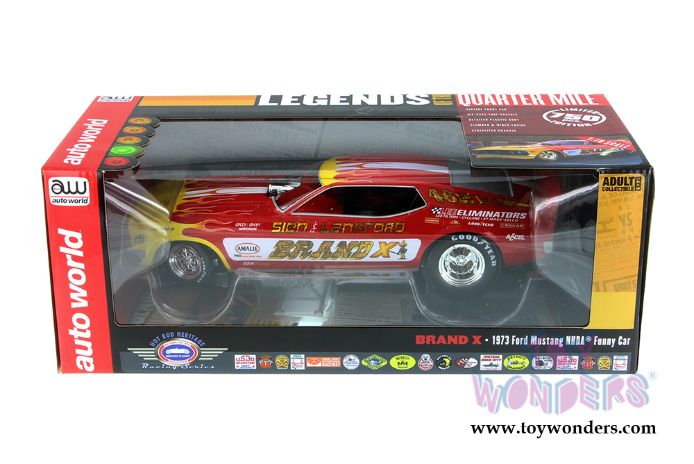 Auto World Legends - Brand X Ford Mustang NHRA Funny Car (1973, 1/18 scale diecast model car, Red w/Yellow Flames) AW1167