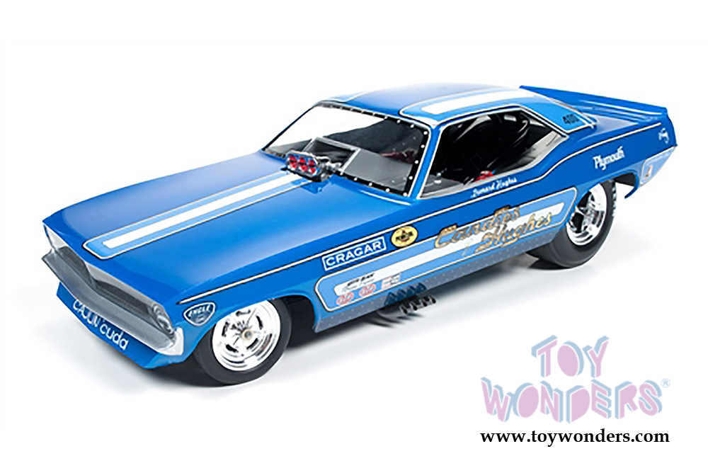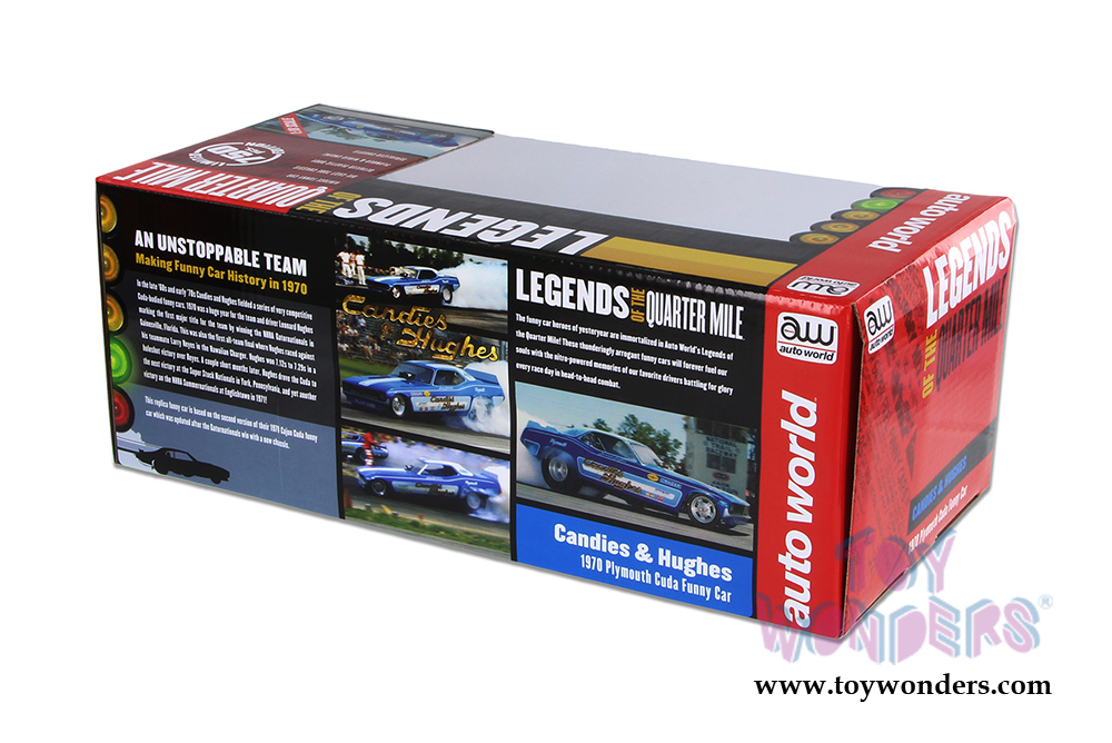 Auto World Legends - Candies & Hughes Plymouth Cuda NHRA Funny Car (1970, 1/18 scale diecast model car, Blue w/ White Stripes) AW1172