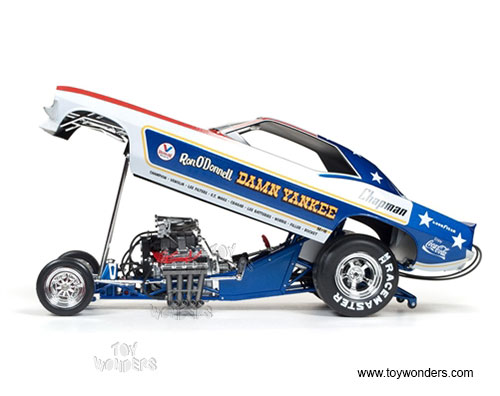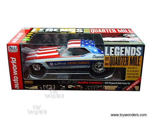 AW1164 Auto World Legends of The Quarter Mile - Damn Yankee - 1970 Plymouth Cuda NHRA Funny Car. 1:18 scale diecast collectible model car. This Plymouth Cuda is a 10"L x 3.5"W x 2.75"H car with plastic body, diecast tube chassis, plumbed and wired engine. This 1970 Cuda is manufactured by AutoWorld. Individually packed in a window box. Box size: 13.25"L x 6.1"W x 5"H. AW1164 is in BLUE, RED and WHITE colors (USA Flag colors).