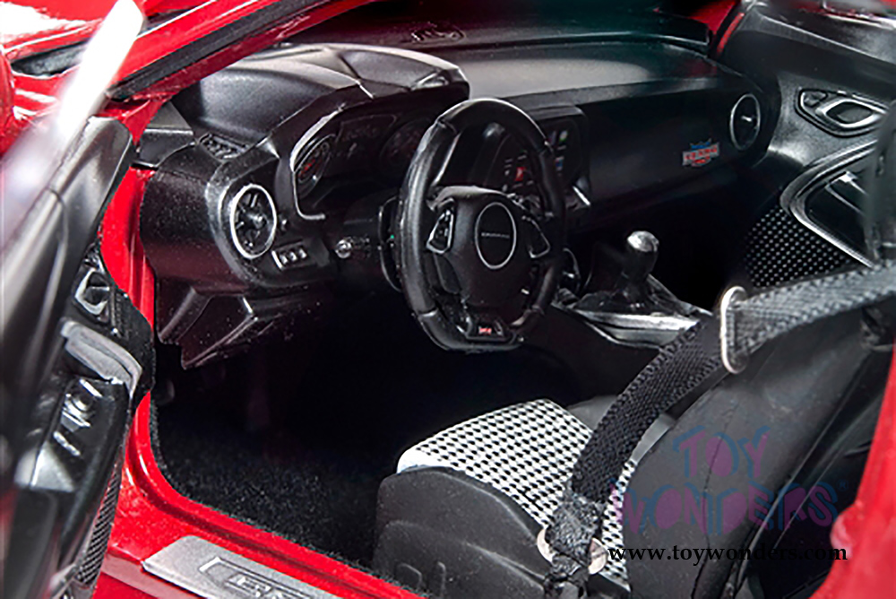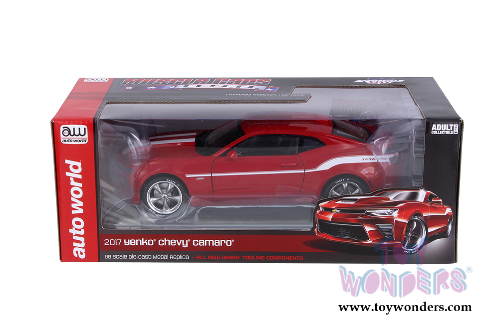 AW246 Auto World - Muscle Cars USA | 2017 Yenko® Chevy® Camaro® Hardtop. 1:18 scale diecast collectible model car. This Chevrolet Camaro is a 10"L x 4"W x 3"H diecast metal car with openable hood, doors and trunk, steerable front wheels. Featuring an accurate interior, chassis, trunk and detailed engine. This 2017 Chevy Camaro is manufactured by Auto World. Individually packed in a window box. Box size: 13.25"L x 6.1"W x 5"H. AW246 is in RED color with white stripes. GM is a trademark of the General Motors Corporation.