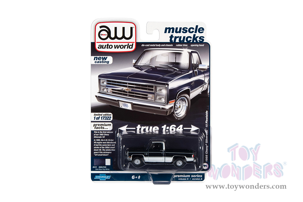 Auto World Premium - 2021 Release 5 | Chevrolet® Silverado™ Pickup Truck "Muscle Trucks" (1985, 1/64 scale diecast model car, Dark Blue Poly Body w/White Lower & White Roof) AWSP087/24A