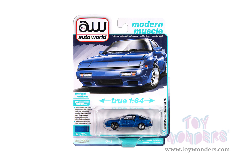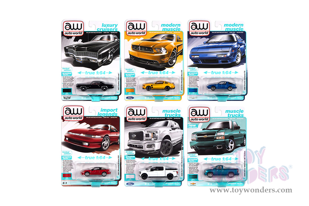 AW64502/12A Auto World Premium - 2025 Release 1 Set A. 1:64 scale diecast collectible model. 6-car set. These cars are approximately 2.75" to 3.5" long die cast metal cars. These cars feature detailed die-cast metal body and chassis, opening hoods, authentic factory colors and accurately scaled matching rims with rubber tires. Very Limited Quantities. Each car individually blister carded. Card size: 5.5" x 7.5". 6 pcs/inner. Manufactured by Auto World. AW64502/12A is in assorted colors and styles.