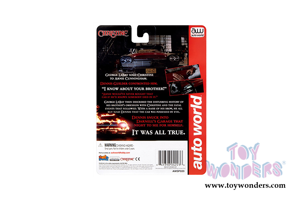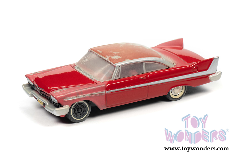 AWSP039/24 Auto World Silver Screen Machines - 1958 Christine Plymouth Fury Hardtop Partially Restored. 1:64 scale diecast collectible model. This car is about 2.75" long diecast metal car. These cars feature detailed diecast metal body and chassis, authentic factory colors and accurately scaled matching rims with rubber tires. Each car individually blister carded. Card size: 5.5" x 7.5". Manufactured by Auto World. AWSP039/24 is in RED color. GM is a trademark of the General Motors Corporation.