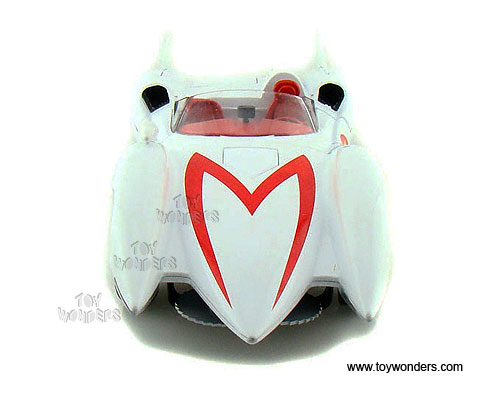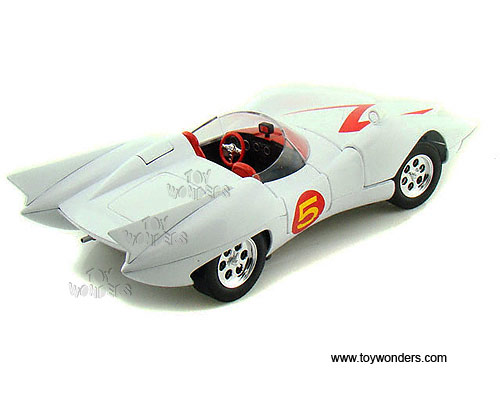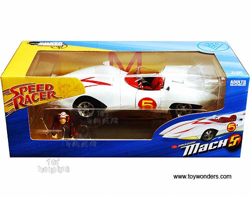 AMM971 Auto World Silver Screen Machines - Speed Racer Mach #5 with a Monkey Figure. 1:18 scale diecast collectible model car. This Speed Racer Mach #5 is an 11"L x 4"W x 2.5"H die-cast metal car with openable doors, hood & trunk. This Speed Racer Mach is manufactured by AutoWorld. Individually packed in a window box. Box size: 13.25"L x 6.1"W x 5"H. AMM971 is in WHITE color.