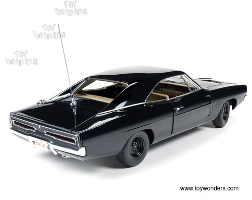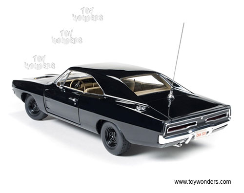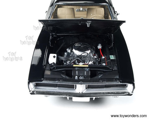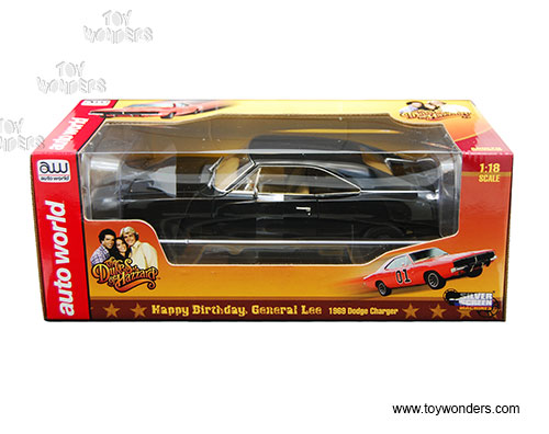 AWSS110 Auto World Silver Screen Machines - 1969 The Dukes of Hazzard "Happy Birthday General Lee" Dodge Charger. 1:18 scale diecast model car. 11.5" 1969 Dodge Charger, diecast metal classic muscle car with workable steering, and openable hood, doors & trunk. Detailed engine, accurate interior, chassis & trunk. Entertainment movie car. RC2 Brands. AWSS110 is in BLACK. Individually packed in a window box. Box size: 13.25"L x 6.1"W x 5"H.