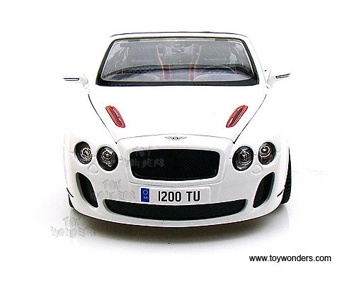 11035W BBurago Diamond - Bentley Continental Supersports Convertible ISR. 1:18 scale diecast collectible model car. This Bentley Continental Supersports is a 9.75"L x 3.75"W x 2.5"H diecast metal car with openable hood, doors, and trunk. Italian design. The Bentley Continental Supersports is manufactured by BBurago. Item 11035 is in WHITE color. Individually packed in a window box. Box size: 11.75"L x 7"W x 4.75"H.