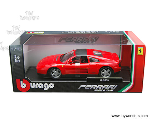 16006R BBurago Ferrari Race & Play - Ferrari 348TS Hardtop. 1:18 scale diecast collectible model car. This Ferrari 348TS is a 9"L x 3.75"W x 2.25"H diecast metal car with openable hood, doors, and trunk. Italian design. This Ferrari 348TS Race is manufactured by Bburago. Item 16006R is in RED color. Individually packed in a window box. Box size: 13"L x 6.5"W x 5"H.