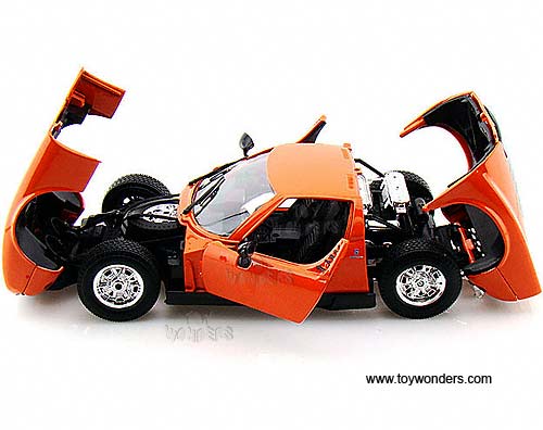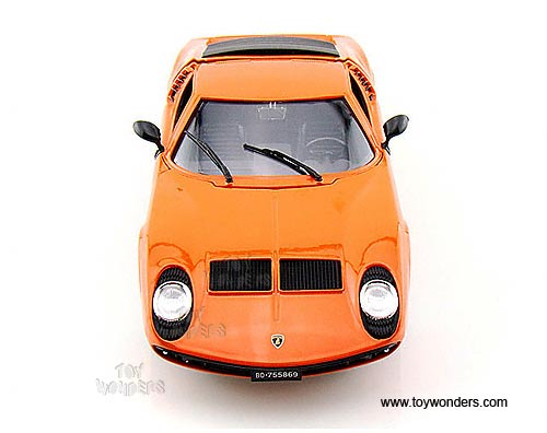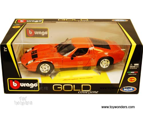 12072 BBurago Gold - 1968 Lamborghini Miura Hardtop. 1:18 scale diecast collectible model car. This Lamborghini Miura is a 9.25"L x 3.5"W x 2.25"H diecast metal car with openable hood and doors. Italian design. The 1968 Lamborghini Miura is manufactured by BBurago. 12072 is in ORANGE color. Individually packed in a window box. Box size: 11.75"L x 7"W x 4.75"H.
