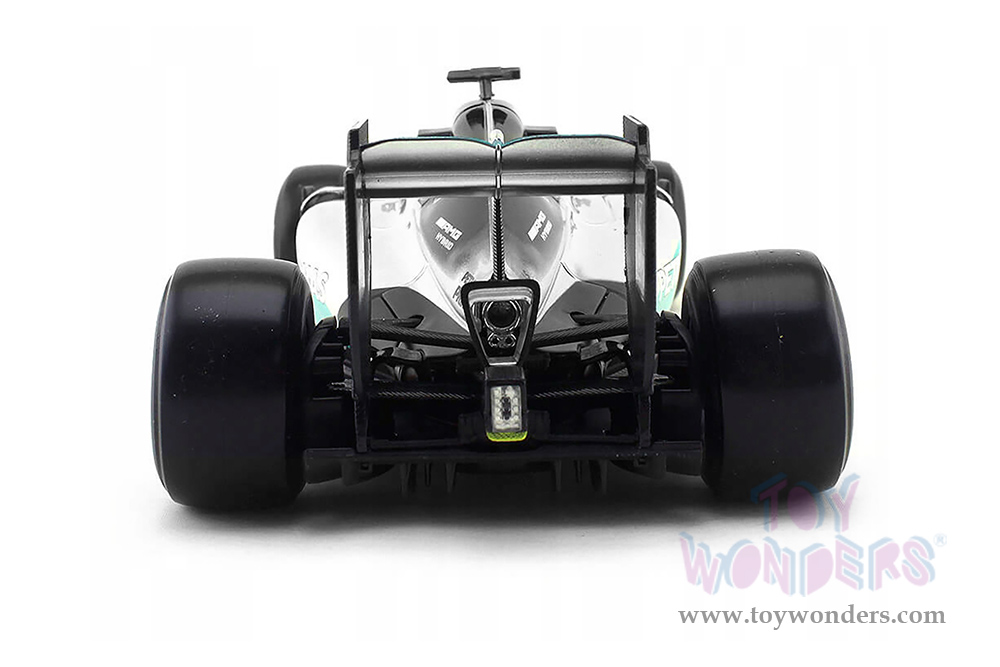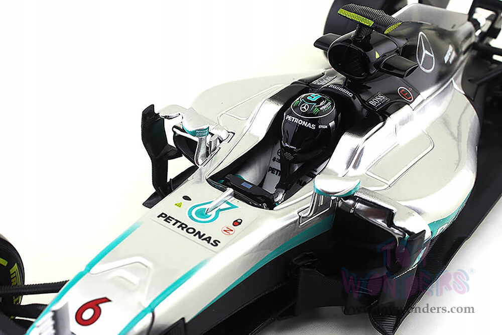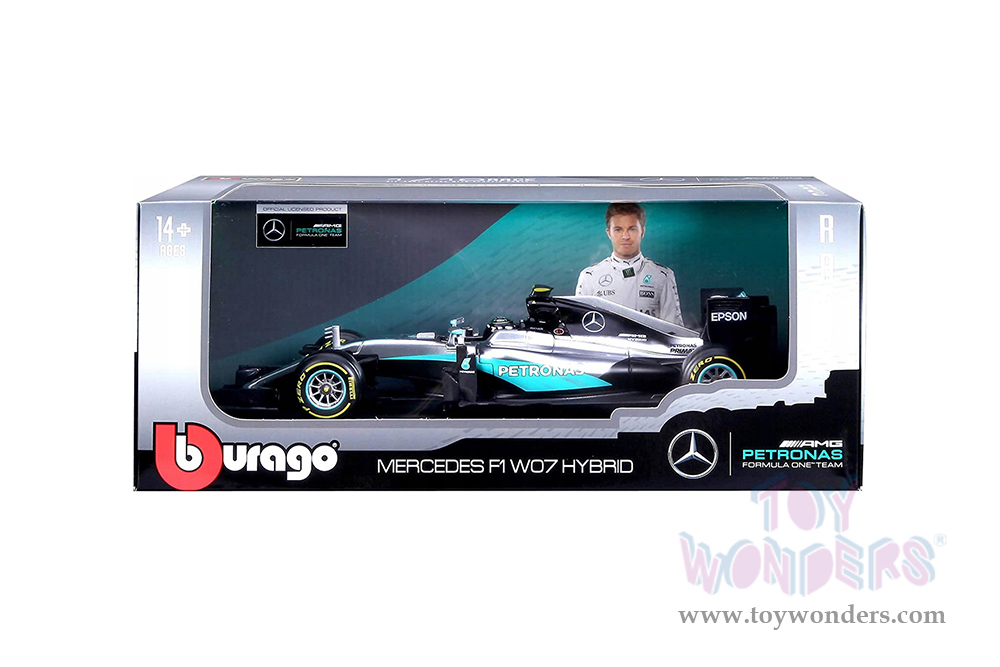 18-18001ROSB BBurago - Mercedes AMG F1 W07 Hybrid Petronas #6 Nico Rosberg Formula 1 (2016). 1:18 scale diecast collectible model car. This Ferrari is a 12"L x 4.5"W x 2.5"H die-cast metal car. Extensive detail across the body, electrostatic paint coating. Sits on a display plaque. Sponsored by Pirelli, Qualcomm, Epson and more. This Mercedes F1 Formula is manufactured by Bburago. 18-18001ROSB is in silver and turquoise. Individually packed in a window box. Box size: 13.75"L x 7.5"W x 5.5"H.