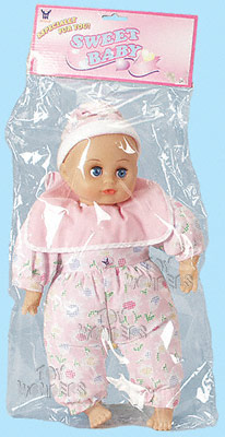 0262P Baby Doll with Sounds. 18" soft stuffed baby doll with hat. Makes crying/laughting sound, and says mom/day. Assorted color cloths. Pkg size: 8"x21". Case pack: 36 pcs. Price below is for 1 case (36 pcs).