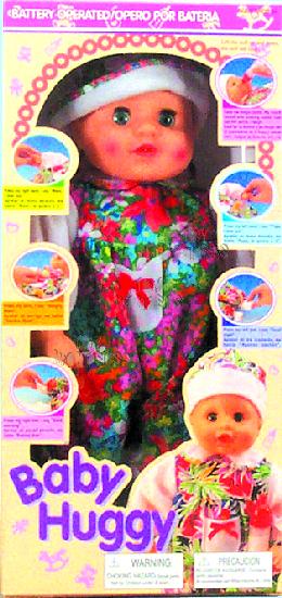 PT1686S Baby Huggy (Spanish). 15.75" baby doll speaks different phases when feet and hands are pushed. Includes a baby bottle. Requires 3 "AA" batteries. Box size: 8"Lx4.75"Wx16.75"H. 6 pcs/inner.