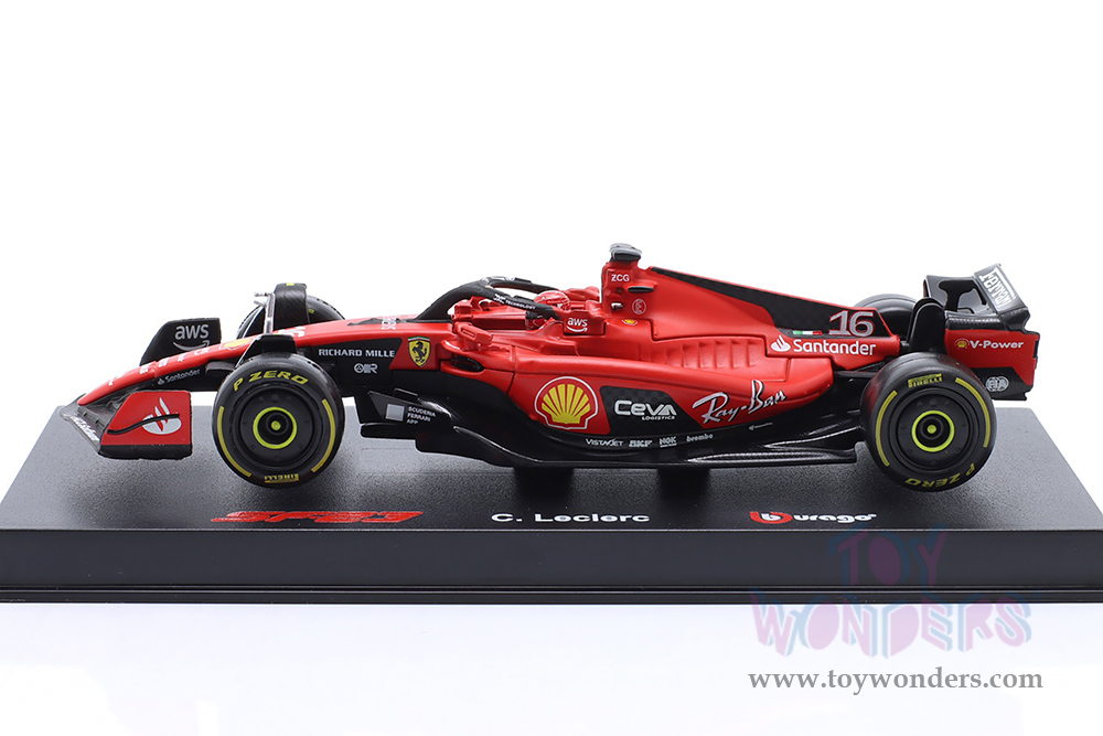 18-36835/16 Bburago Formula Racing - Ferrari SF-23 #16 Charles Leclerc with Driver Formula One F1 Scuderia Ferrari (2023). 1:43 scale diecast collectible model car. This Ferrari is a 5"L x 1.75"W x 1"H die-cast metal car. Extensive detail across the body, electrostatic paint coating. Sponsored by Ray-Ban, Shell, AWS, UPS, Santander, and more. This Ferrari F1 Formula is manufactured by Bburago. Item 18-36835/16 is in red color. Individually packed in a hard-plastic case with a black beveled display base. Case size: 5.75"L x 2.875"W x 2.625"H.