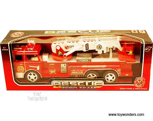 1911/8 Bump & Go Rescue Fire Engine w/ IC Sound. This Fire Truck is 11.75" long with retrackable & 360 degree turnable bucket. Requires 3 "AA" batteries (not included). Individually packed in a window box. Box size: 13"L x 3.25"W x 4.5"H. Note: This item contains no any diecast metal.