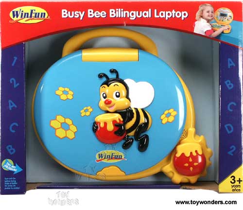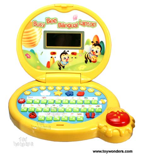 12110ES Battery Operated Busy Bee Bilingual Laptop. English and Spanish Learning computer features cheerful melodies, 12 interactive learning activities including the categories of letters (include letter sounds), words, numbers, games and music, 10 number buttons convert to 10-note musical keypad, large LCD screen with fun animations, alphabet keyboard with sound effects, volume and LCD contrast adjustment, Built-in handle. In a TRY ME box. This PC is for ages 3+ years. Includes 3 "AA" batteries. Box size: 15"Lx 12.25"Wx 3.5"H. 6 pcs per inner.
