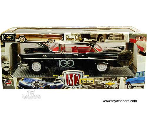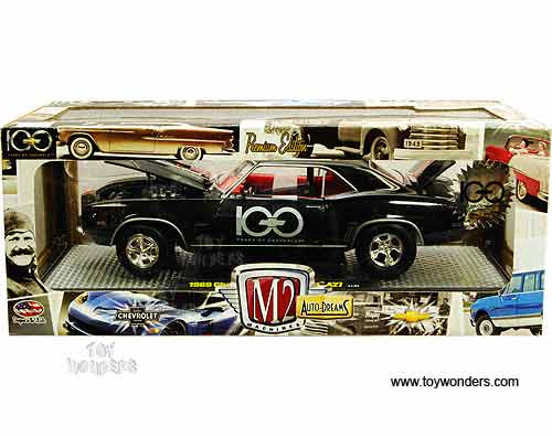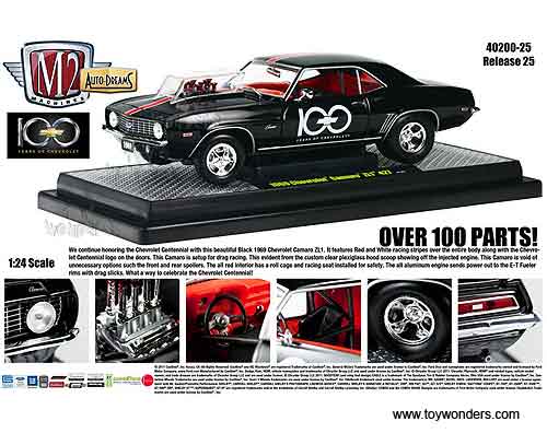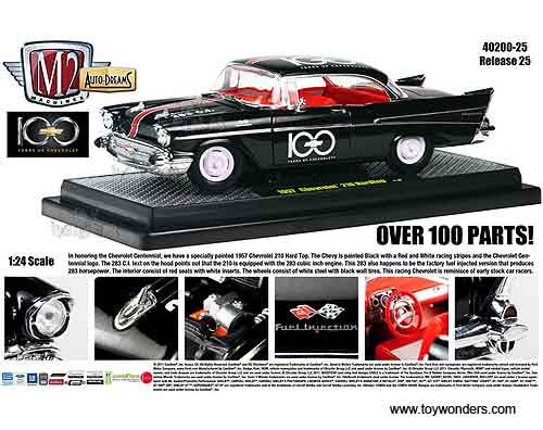 40200/25 Castline M2 Machines Auto-Dreams Premium - 1957 Chevy 210 Hard Top & 1969 Chevy Camaro Hard Top. 100 years of Chevrolet. 1:24 scale diecast collectible model car. Each car sits on a display plaque. Manufactured by Castline. Individually packed in a window box WB. Box size: 10"L x 5"W x 4"H. GM is a trademark of the General Motors Corporation.