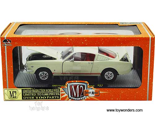 40300/37A Castline M2 Machines Detroit-Muscle - 1965 Ford Mustang GT 2+2 Fastback Hard Top. 1:24 scale diecast collectible model car. This 65 Ford Mustang GT 2+2 Fastback is a 7.5"L x 2.75"W x 2"H die-cast collection car with openable hood, doors & trunk. Each car sits on a display plaque. This Ford Mustang GT 2+2 Fastback is manufactured by Castline. Individually packed in a window box WB. Box size: 10"L x 4.75"W x 4.25"H. 40300/37A is in WIMBLEDON WHITE color. Limited edition 1 of 5000 pcs.