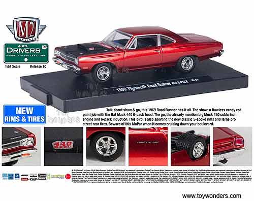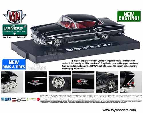 11228/10 Castline M2 Machines - Drivers Release 7. 1:64 scale diecast collectible models, 3" long die cast model cars. GM is a trademark of the General Motors Corporation. Each car sits on a display plaque, and individually blister carded. Card size is 5.5" x 7.25". Manufactured by Castline. 6 pcs per inner. Assortment includes: