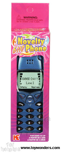 20131B Toy Cellular Phone. This mobile phone features ringing, and talking: Information, May I help you? The telephone comes in assorted colors. This Toy portable phone resembles a Nokia cell phone. TRY ME packaging. Includes 2 "AA" batteries. Box size: 2"Lx 1.25"Wx 6"H.