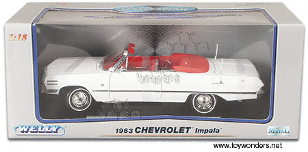 9865CW WELLY Chevrolet Impala Convertible(1963). 1:18 scale. This 1963 Chevy Impala measures: 11"Lx4"Wx3.5"H diecast car with opening doors/hood. The 63 Impala features stteerable front wheels, detail components, and a display stand. This 1963 Chevrolet Impala is from Welly. WHITE color.
