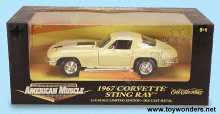 36122YL ERTL -American Muscle Chevrolet Corvette Sting Ray (1967) Scale: 1:18 Dimensions: 9.75"L x 3.75"W x 3"H 1967 Corvette die cast metal classic muscle car with working steering, shifter detail, side view mirrors, free wheels, and opening doors/hood. Features highly detailed engine & components. Manufactured by RC2 Brands Individually packaged in window box Window box: 13.5"W x 5.75"H x 6.25"D Color: Yellow with black stripe & interior