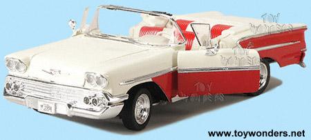 DP8018/24 Chevrolet Impala (1958) 1:24 scale. This 1958 Chevy Impala is 8.5" long x 3.25"W x 2.5"H. The 58 Impala is diecast metal, free-wheeling convertible and features opening doors/hood. This 1958 Impala comes painted in the same way they use to paint the real one in assorted 2 tone colors. 4 pcs per display box. 12 pcs per inner box. This 58 Chevy is manufactured by Saico.