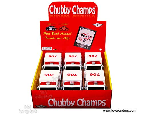 88003 Chubby Champs - Ambulance. This Ambulance is a 4.75"L x 2.75"W x 2.75"H rescue vehicle with pullback motor action. 6 pcs per display box. Note: This item contains no any diecast metal.
