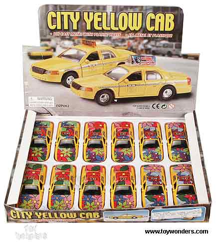 9989F City Yellow Flower Taxi Cab. This taxi is a 5"Lx 2"Wx 1.75H diecast yellow taxicab with openable doors and pull-back motor action. 12 pcs per display box and in assorted styles. 72 pcs per inner box.
