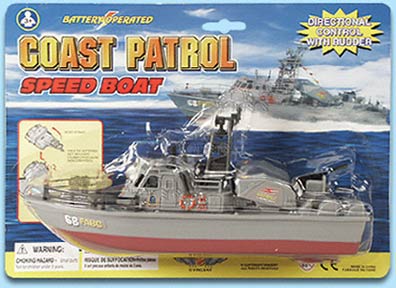 9016E Coast Patrol Speed boat. Includes: Directional control with rudder. Assorted styles and color. Batteries required, not included. 12 pcs per inner box.