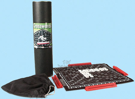 50040 Crossword. 12" cylinder tube contain a 11" x 11" roll out crossword puzzle mat, letters, 4 letter-holders and also a black sac to hold letter pieces.
