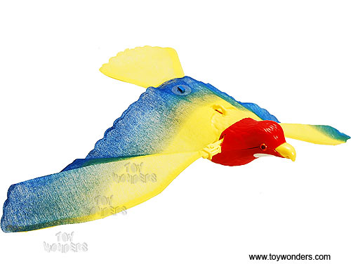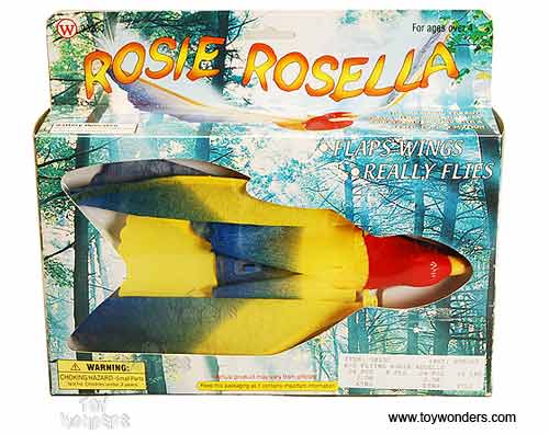 9023C DY TOYS Flying Rosie Rosella. 8.5" long with a 17" wingspan. Battery operated, flying parrot. The parrot flies around in a circular motion on a string with flapping wings. Requires two "AA" batteries.