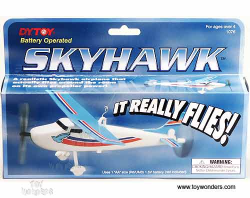 1076 DY TOYS flying Skyhawk. 8.25" long x 7.5" wing span, with spinning propeller, battery operated plane flies in a circle from your ceiling when attached by included string and ceiling mount. Looks similar to a Cesna airplane. Requires one "AA" battery (not included). Hang-up box is 9.25"W x 5.75"H x 2"D. Note that this item contains no diecast metal. Airplane is made of sturdy plastic. Excellent quality motor too.