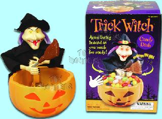 9660 DY TOYS Trick Witch. 8" tall motion sensor witch that gives you a scare when you reach into her kettle. Her red eyes light up, arms close upon your hand, and a scary witch laughter sound. Requires 3 "AA" batteries (not included). Candy bowl measures 5.75" in diameter and 3.25" tall. Box size: 6.5"L x 6.25"W x 9"H.