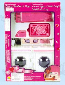 TW3010 Deluxe Washer & Dryer The set includes washer, dryer, ironing board, iron, hangers, & other accessories. scaled for 11.5" dolls. requires 2 "AA" batteries. box size: 8.75"Lx4"Wx12.75"H.