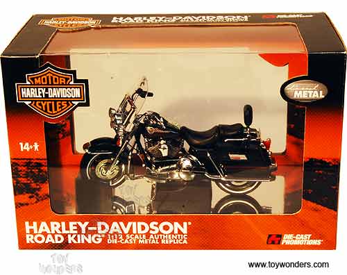 81001 Die-Cast Promotions - 2006 Harley-Davidson FLHRI Road King Motorcycle. 1:12 scale diecast collectible model. This motor bike is a 7.5"L x 2.5"W x 4.25"H, diecast metal and plastic motorcycle. Extremely detailed engine and components. This Harley Davidson motorcycle is manufactured by Die-Cast Promotions. Individually packed in a window box. Box size is 12"L x 6.1"W x 7.6"H. 81001 is in BLACK PEARL color.