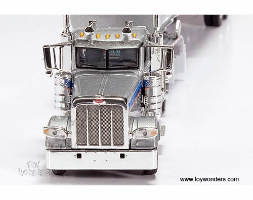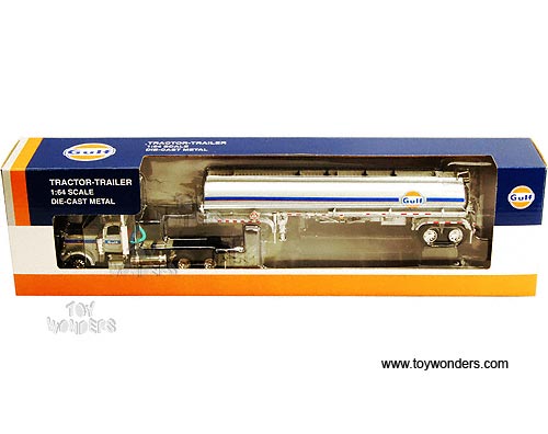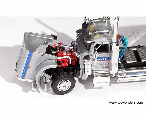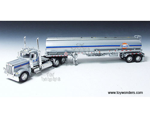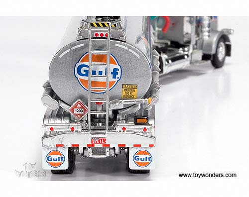 32318 Die-cast-Promotions Gulf Oil - Peterbilt 389 Cab w/ Petroleum Tanker. 1:64 scale diecast collectible model car. This Peterbilt 389 tractor trailer is a 12"L x 1.5"W x 2"H die cast metal car with openable hood & removable tanker. This Peterbilt 389 Oil Tanker is manufactured by Die-cast Promotions. Item 32318 is in SILVER color. Individually packed in a window box. Box size: 15.75"L x 2.75"W x 4.1"H.