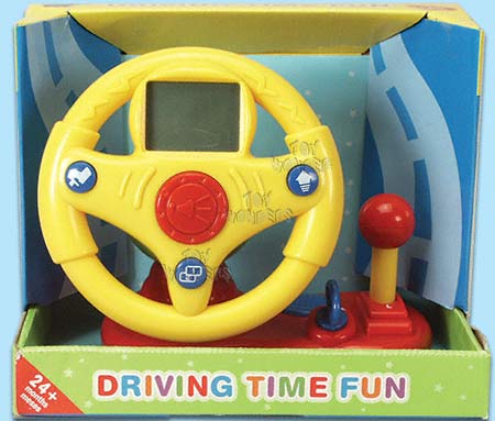 1079 Driving Time Fun. 7" yellow steering wheel w/ LCD screen for 2 games. Vehicle sounds & vibrations. Also has key ignition & gear shift. Includes 3 "AA" batteries. Ages 2 years & up. Box size: 10.75"L x 6.5"W x 8.5"H. 6 pcs/inner.
