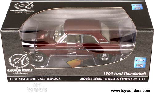 39486BG ERTL American Muscle Authentics - 1964 Ford Thunderbolt Hard Top. 1:18 scale diecast collectible model car. This Ford is a 10.75"Lx 3.75"Wx 3"H die cast metal with openable hood, doors & trunk. Realistic headlights and tailights, highly polished electro-plated chrome parts, realistic hnges on doors, and removable hood pins. This 1964 Ford is manufactured by RC2 brands Authentics. Individually packed in a window box. Box size: 13.75"Lx 6.25"Wx 5.75"H. 39486 in BURGUNDY color.