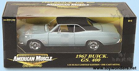 29258 ERTL - American Muscle 1967 Buick GS 400 Hard Top Limited Edition 1 of 2,500 pcs Scale: 1:18 Dimensions: 11" long x 4"W x 3"H 1967 Buick GS 400 die cast metal classic muscle car with workable steering, opening doors and hood, free wheel, and folding seats. Good Year tires and highly detailed engine & components. Sits on a display platform. General Motors. Box: 13.5"W x 5.75"H x 6.25"D Manufactured by RC2 Brands; ref. no. 29258 Color: Metallic blue with black top GM is a trademark of the General Motors Corporation
