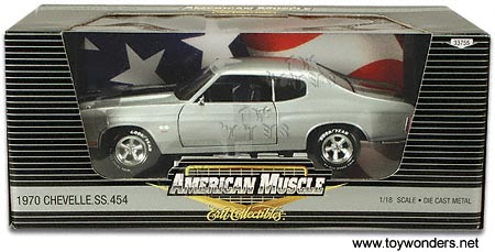 33755 ERTL - American Muscle 1970 Chevy Chevelle SS454 Hard Top Limited Edition 1 of 2,500 pcs Scale: 1:18 Dimensions: 11"L x 4"W x 3.25"H Chevelle hard top die cast metal muscle car with opening doors & hood. Features workable steering, black interior, and two black racing stripes. Manufactured by RC2 Brands Individually packaged in a window box Color: Silver