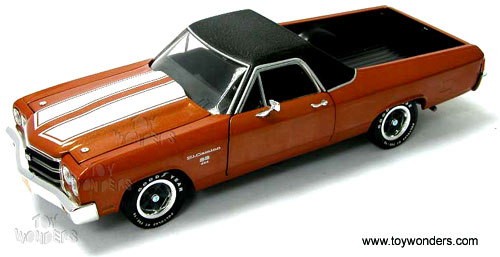 33948CO ERTL - American Muscle 1970 Chevy El Camino SS Pick Up Truck. 1:18 scale diecast model car. This Chevrolet pickup is 12"Lx 4"Wx 2.75"H with opening doors & hood. Limited edition, serialized chassis, steerable front wheels and detailed interior & chassis. This pick-up truck is manufactured by RC2 Brands. Individually packed in a window box. Box size: 13.75"Lx 6.25"Wx 5.75"H. 33948 in COPPER color.