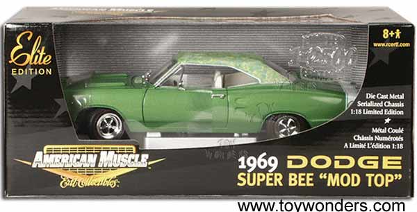 33980GN ERTL Elite American Muscle - 1969 Dodge Super Bee "Mod Top". 1:18 scale diecast model car. Elite Limited Edition 1 of 2,500 pcs. This 69 Super Bee features opening hood & doors. White stripe on tail. Black color hood. This 1969 Dodge Super Bee is manufactured by American Muscle. RC2 Brands. Individually packed in a window box. 33980 in GREEN color.