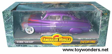 7123DP ERTL - American Muscle 1949 Ford Mercury Lead Sled. 1:18 scale diecast model car. This 1949 Ford Mercury Lead Sled has opening hood & doors with metallic purple color exterior and red flame designs on nose and front fenders. This 49 Ford Mercury is manufactured by ERTL. RC2 Brands. 7123D in PURPLE color. Individually packed in a window box.