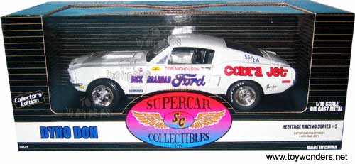 29141PW SUPERCAR 1968 Ford Cobra Jet Mustang SS/EA Scale: 1:18 Dyno Don Supercar Heritage Racing Series #3. Don Nicholson's '68 Ford Cobra Mustang. Outfitted with Good Year tires. Manufactured by ERTL Individually packaged in window box Color: White with black interior