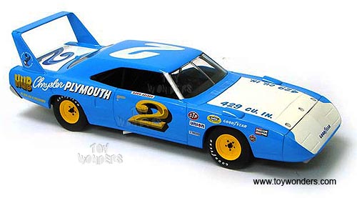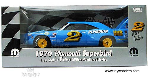 29529BU ERTL Mopar - 1970 Plymouth Superbird Race Car #2 Norm Nelson. 1:18 scale diecast collectible model car. This Plymouth Superbird Racing Car is an 11.75"L  die cast metal car with openable doors & hood, detailed interior & chassis, steerable front wheels, and limited edition numbered series. Sits on a display stand. This 1970 Plymouth Superbird is manufactured by RC2 Brands. 29529 is in BLUE color. Individually packed in a window box.