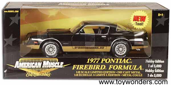36678PBK ERTL - American Muscle 1977 Pontiac Firebird Formula. 1:18 scale diecast model car. Limited Hobby Edition 1 of 5,000 pcs. Opening hood, doors, and trunk. Black interior, gold trim & Good Year tires. RC2 Brands; ref. no. 36678P in BLACK color.