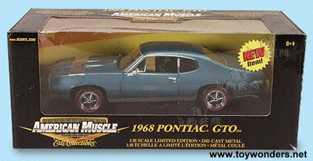 36673OU ERTL - American Muscle 1968 Pontiac GTO Hard Top. 1:18 scale diecast collectible model car. This 1968 Pontiac GTO is an 11" long x 4"W x 3.5"H diecast metal classic muscle car with workable steering, sideview mirrors, exhaust, red inner lining on tires, GTO Pontiac emblem on rear panel, free wheels, folding seats, and opening doors/hood. This 68 Pontiac GTO has highly detailed engine & components. Sits on a display platform. Individually packed in a window box. Box measures 13.5"W x 5.75"H x 6.25"D. American Muscle Classics. Manufactured by RC2 Brands. 36673O in metallic BLUE color. GM is a trademark of the General Motors Corporation.