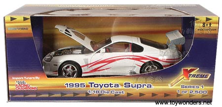 33738W ERTL Racing Champions - 1995 Toyota Supra Hard Top. 1:18 scale diecast collectible model car. This 1995 Toyota Supra is a 9.25" long diecast with openable doors, hood & trunk. Xtreme series 1. Limited tuner edition 1 of 2,500 pcs. This 95 Toyota Supra is manufactured by RC2 Brands. Individually packed in a window box. 33738 in WHITE color with red graphic.