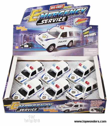 6001D Emergency Service NYC Police SUV. 1:32 scale diecast collectible model car. This rescue team is 5"Lx 2.5"Wx 2.5"H die cast metal with pullback motor action and openable doors. 6 pcs per display box.